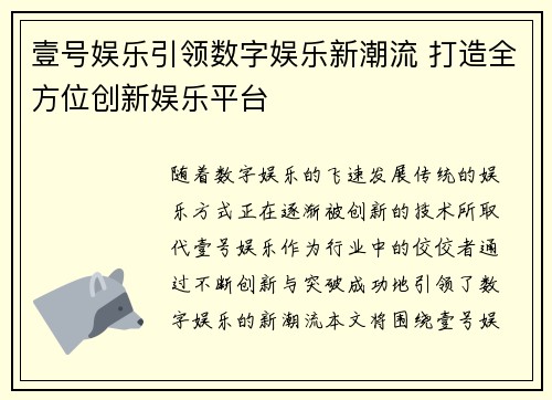 随着数字娱乐的飞速发展,传统的娱乐方式正在逐渐被创新的技术所取代,壹号娱乐作为行业中的佼佼者,通过不断创新与突破,成功地引领了数字娱乐的新潮流。本文将围绕壹号娱乐如何打造全方位创新娱乐平台展开详细分析,从四个方面探讨壹号娱乐如何推动数字娱乐的变革:技术创新、内容创意、平台互动和用户体验。通过对这些方面的探讨,本文旨在展示壹号娱乐在数字娱乐领域中的领先地位,以及它如何为用户带来更具吸引力的娱乐体验。